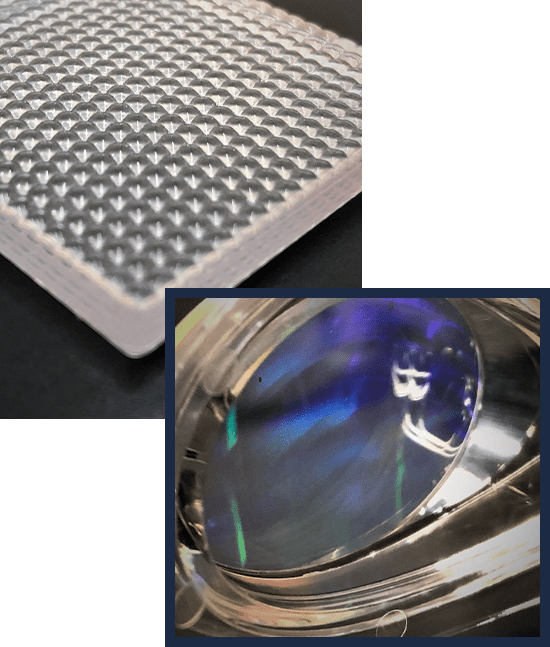 These high-resolution inserts are made from durable hybrid nickel-steel and nickel-shim materials. The molded patterns significantly enhance our plastic products’ optical and mechanical properties. Additional functional and optical coatings can further improve the component performance.